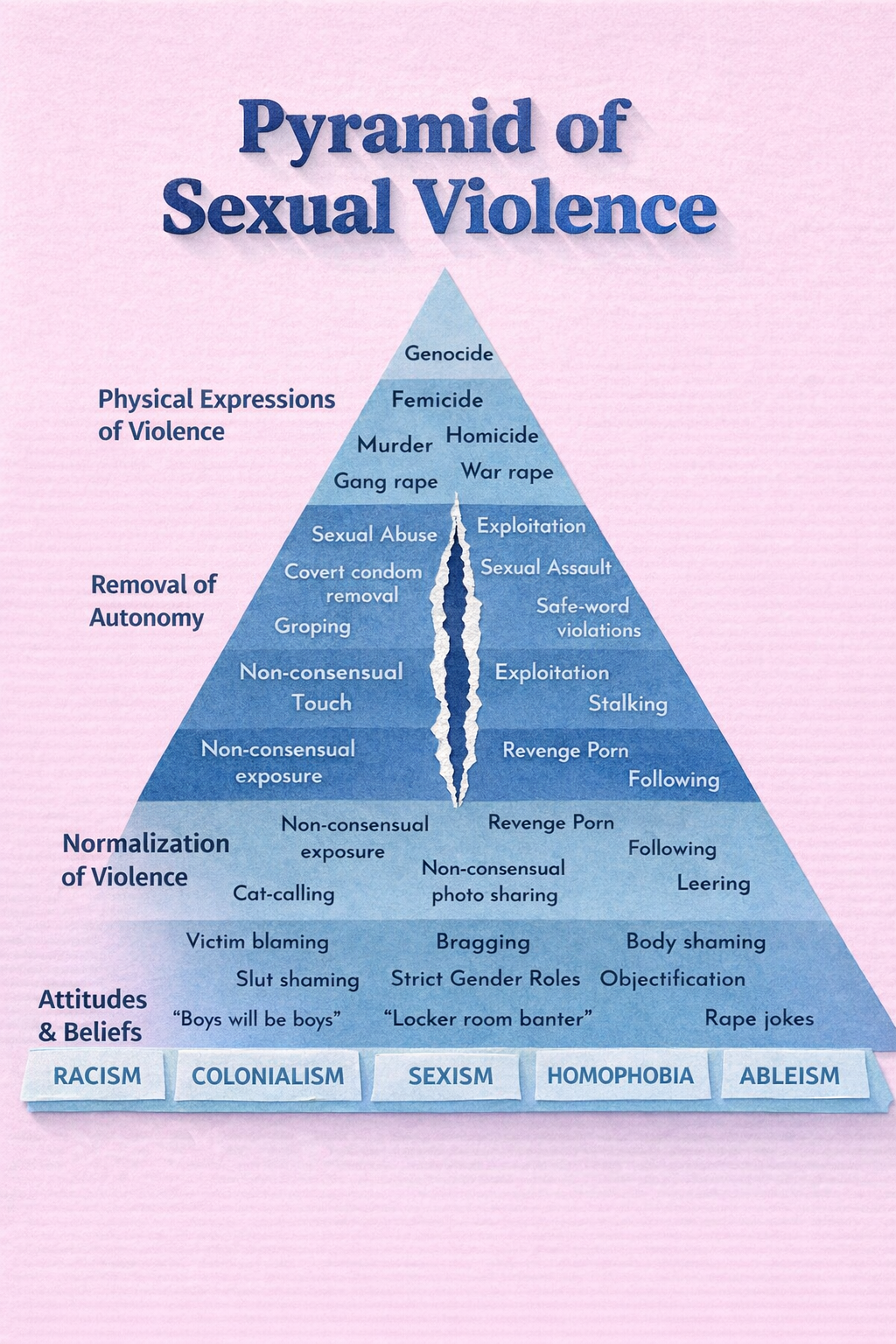 Trauma as it relates to sex goes beyond what we typically think of as “sexual trauma.” Trauma is defined by the APA as “any disturbing experience that results in significant fear, helplessness, dissociation, confusion, or other disruptive feelings intense enough to have a long-lasting negative effect on a person’s attitudes, behavior, and other aspects of functioning.” This definition of trauma in combination with the Pyramid of Sexual Violence allows us to understand how sexual trauma can stem from a variety of experiences, ranging from acute sexual violence (i.e. rape, sexual assault, child sexual abuse) to systemic oppression and beliefs about sex (i.e. internalized or externalized misogyny, racism, ableism, transphobia, etc.). In addition, many folks also hold non-sexual trauma that affects their sex lives (i.e. physical abuse, emotional abuse, accident or injury), and/or may have trauma-related chronic pain that affects their ability to engage with their sexuality. And of course, many (most, if not all) folks have some combination of all of the above.