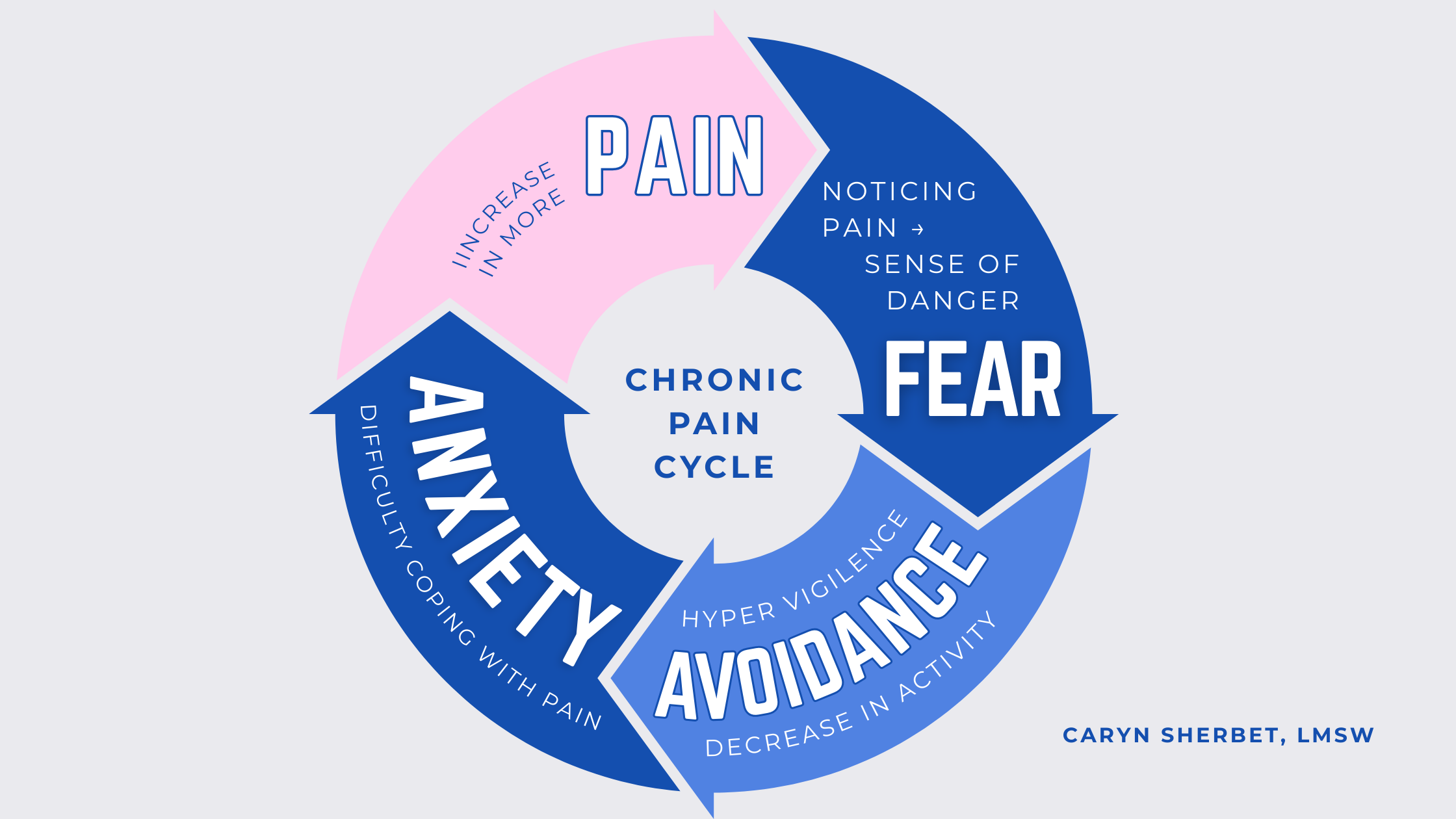 Pain is a danger signal that both triggers, and is triggered by, fear. People often get stuck in the “pain-fear” cycle, where experiencing pain triggers a higher sense of danger, a higher sense of danger triggers more fear, more fear triggers more danger, and more danger triggers more pain.
